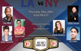VIEWComedians from Los Angeles and New York perform at the same time on a virtual stage. Please join Felicia Madison and Jimmy Shin as they host the first LA VS NY Virtual Zoom show. Comedians include Trey Elliot, Kaela Segal, Catilin Peluffo and KC Arora. Guaranteed laughter from wherever you live!