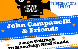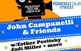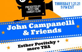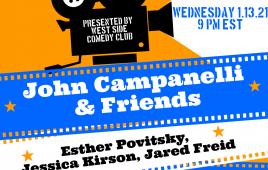 VIEWJohn Campanelli hosts this weekly show with his comedy friends featured on HBO, Comedy Central, Netflix and more. This week's lineup includes Esther Povitsky and Jessica Kirson, Jared Freid, Linette Palladino and more. Lineup Changes Weekly.