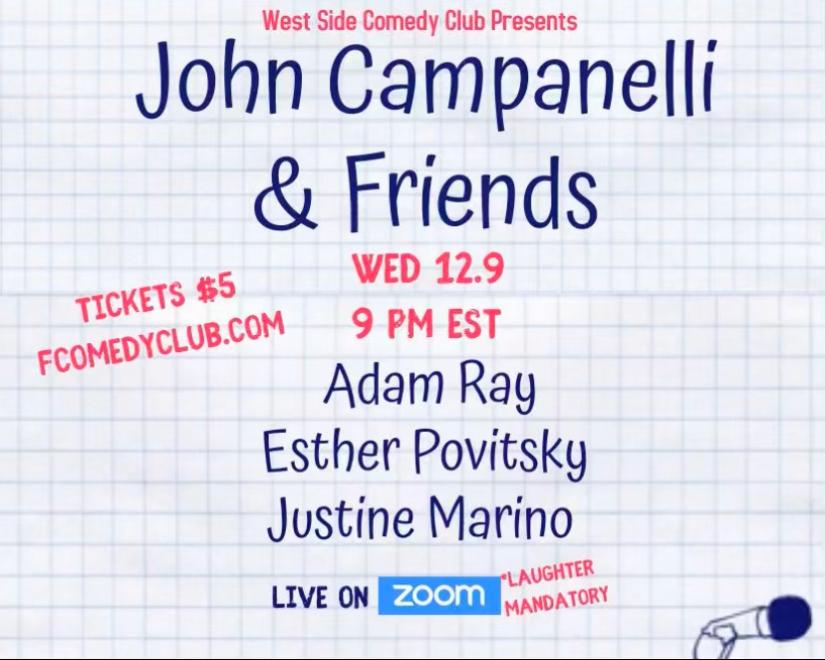 A comedy show featuring John Campanelli and his favorite comedy friends. This week's lineup include Esther Povitsky, Adam Ray and Justine Marino.