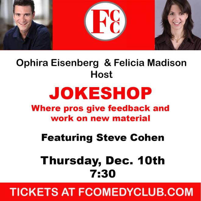 Joke Shop is a fun comedy show contest featuring top stand up comedians helping up and comers to hone their craft. Then some nights they turn their critique to stand up comedy shows to see how they are doing it all wrong. Join us with Karen Bergreen and Clayton Fletcher help fellow F Comedy Comedian Steve Cohen with his stand up and also work out new jokes with Ophira and Felicia. Hosted monthly by Felicia Madison and Ophira Eisenberg.