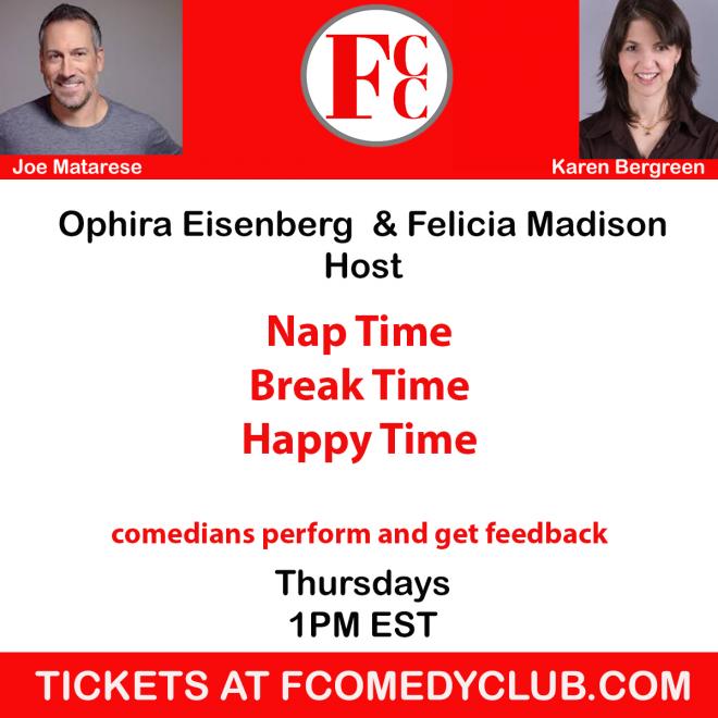 Nap Time Happy Hour is a fun comedy show contest featuring top stand up comedians performing and judging up and comers. Hosted weekly by Felicia Madison and Ophira Eisenberg. A fun time for anyone. Join us with Karen Bergreen and Joe Matarese as we crttique two comedians, Debbie Bazza and a special guest!