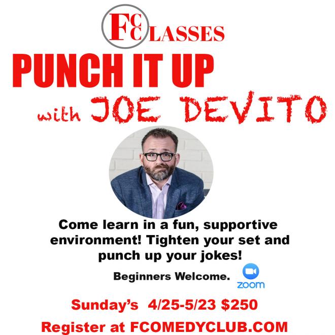 Punch It Up WIth Joe Devito is a 5 week intensive to help punch up and hone your tight five. Five consecutive zoom classes designed to help students sharpen their skills and refine their set for the maximum impact and laughs per minute. Homework will be presented every week and reviewed in session.