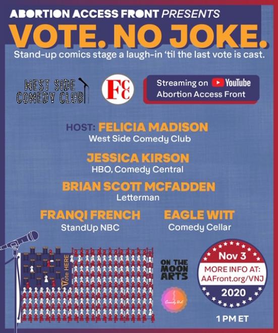 West Side Comedy Club will be performing for Vote. No Joke on November 3rd at 1:00. Line up includes Jessica Kirson, Franqi French, Eagle Witt, Brian Scott McFadden and Host Felicia Madison. To be part of the private zoom group email fcomedyclub@gmail. com and put vote.no joke in the subject.